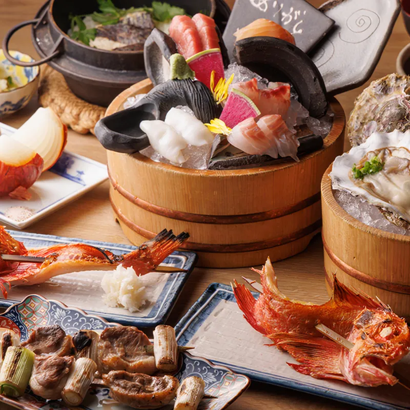 北海道直送の脂がのった金目鯛をお一人様につき丸ごと一本ご提供するほか、牛タン串や鴨ねぎ串、シメには南部鉄器で炊き上げたほかほかの鯛めしなど、贅沢な食材を詰め込んだコースとなっております。